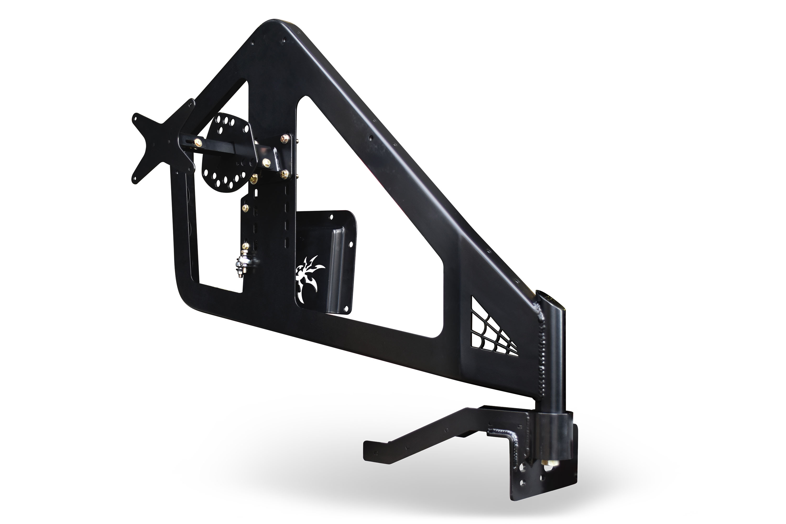 The Poison Spyder Frame Mounted Tire Carrier is engineered for strength, ease of use and bad-ass looks. It fits up to a 40" tire and works with the stock bumper or most aftermarket rear bumpers.
